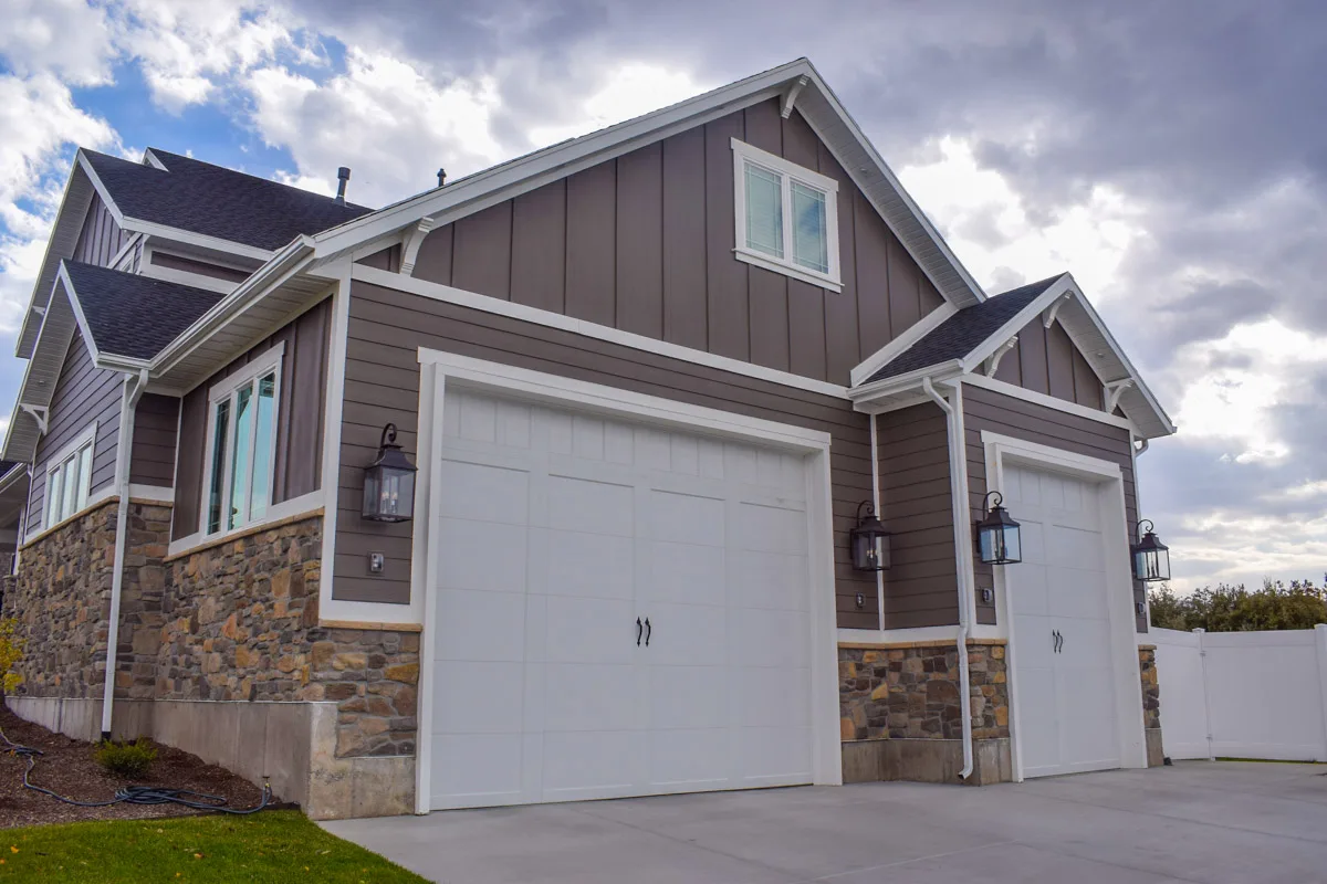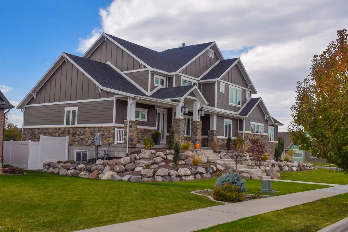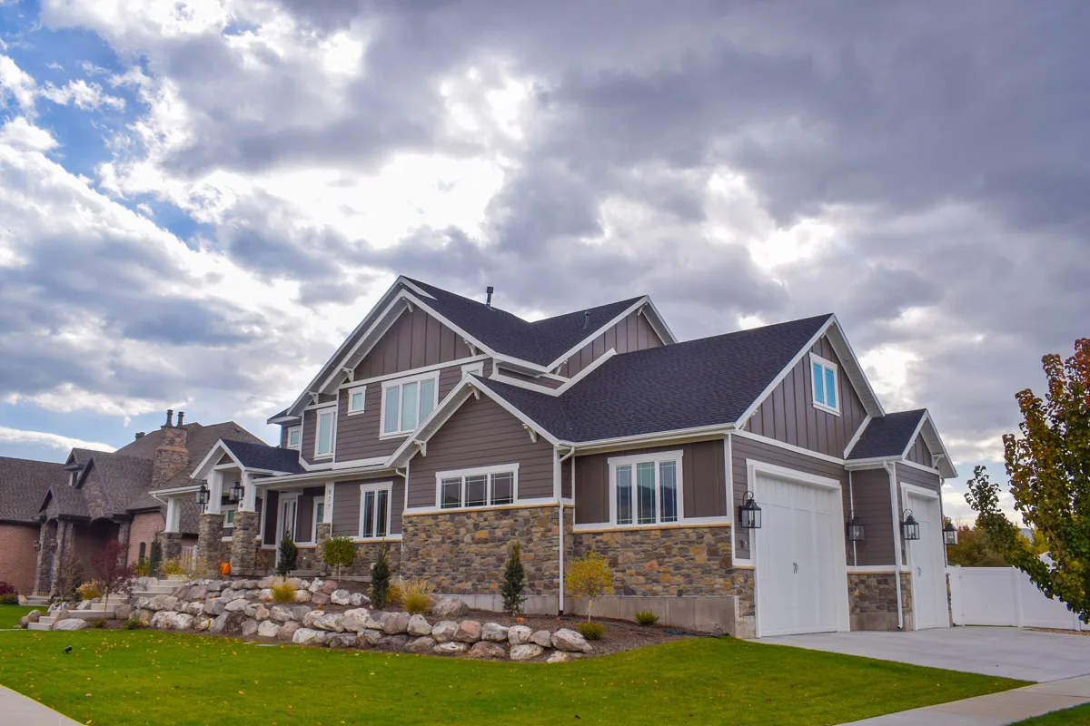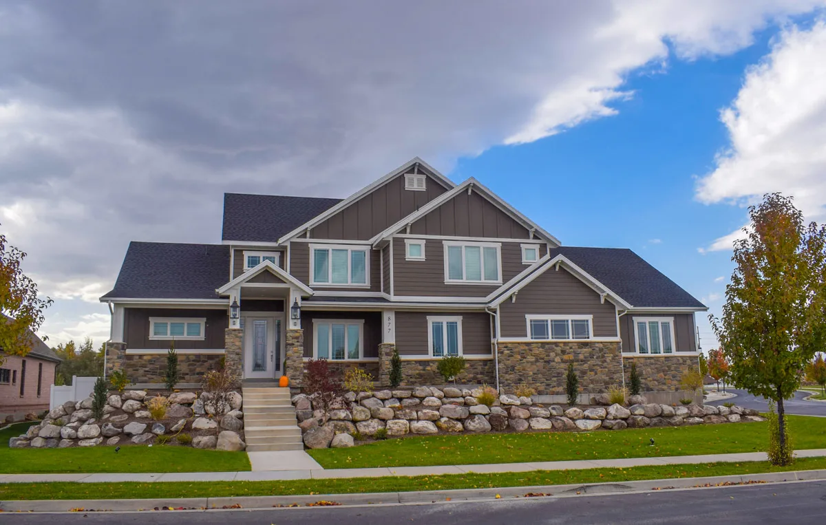 Center Point Construction built this two-story craftsman-style custom home in Bountiful, Utah, designed to combine open-concept living with timeless curb appeal. Featuring decorative rock accents, detailed exterior paneling, and a covered deck, the home reflects a balance of beauty, comfort, and craftsmanship.